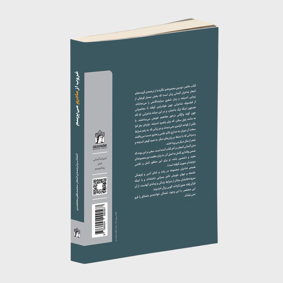 تاب “غروب از مادرم می پرسم” مجموعه ای از اشعار آلمانی است که توسط مترجم گردآوری و به زبانی روان ترجمه شده است و به رغم آنکه سروده های دهه ها وگاه سده های پیشین است،به زبان فارسی دلنشین و شیرین است و با ترجمه ای وفادار به متن اصلی اشعار تصاویری بدیع را پیش چشم خواننده می گذارد، همچون کرنشی به آفرینش، طبیعت و انسان.